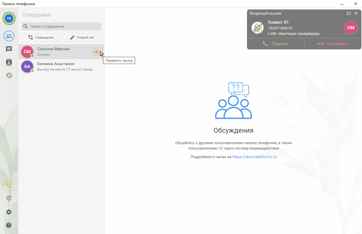 Перевод звонка другому сотруднику возможен как из Панели телефонии, так и из 1С:ERP. Перед выполнением перевода отображается список сотрудников с их статусами (онлайн/занят/нет в сети), что помогает оператору выбрать доступного коллегу перед выполнением перевода.