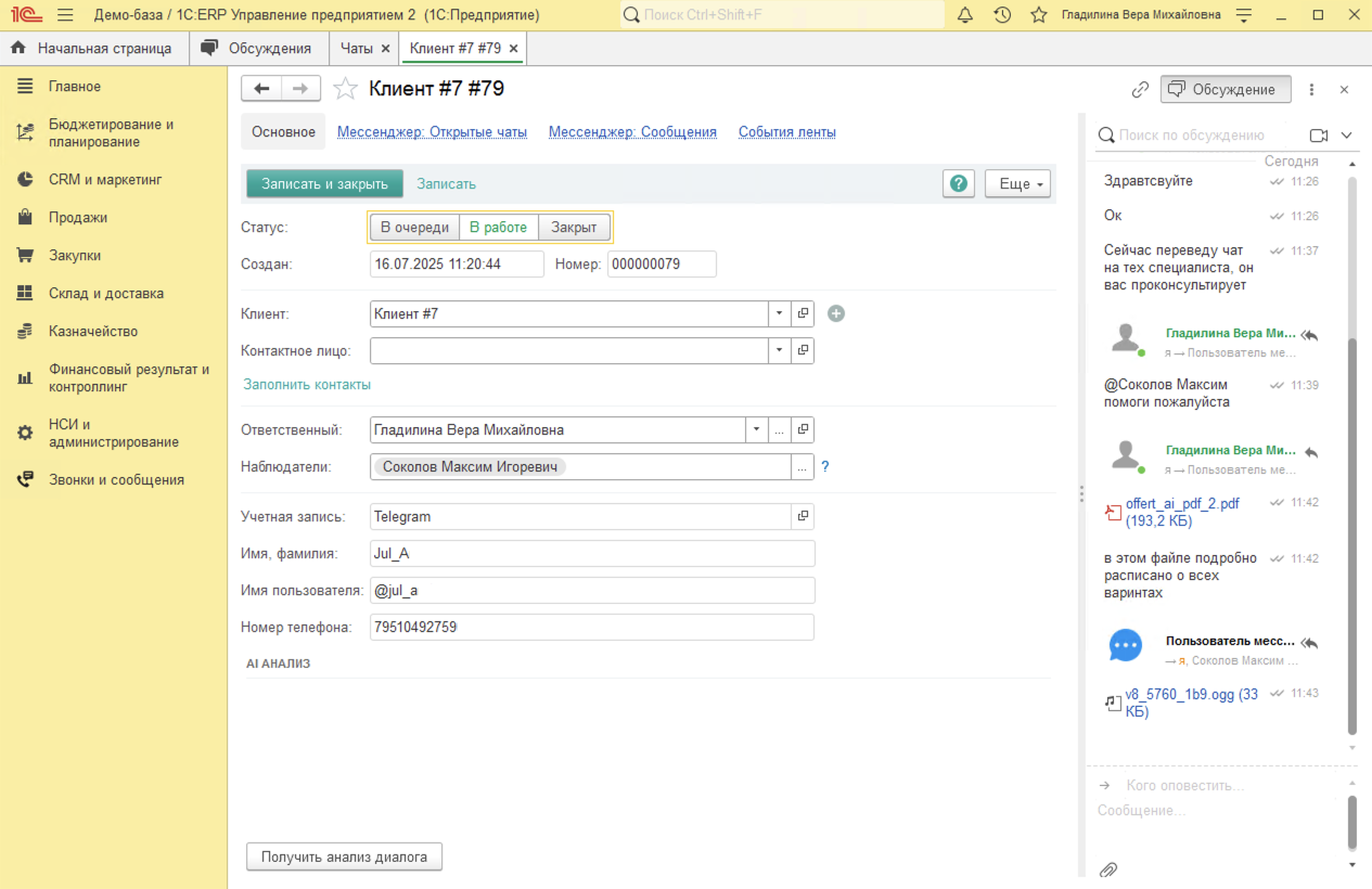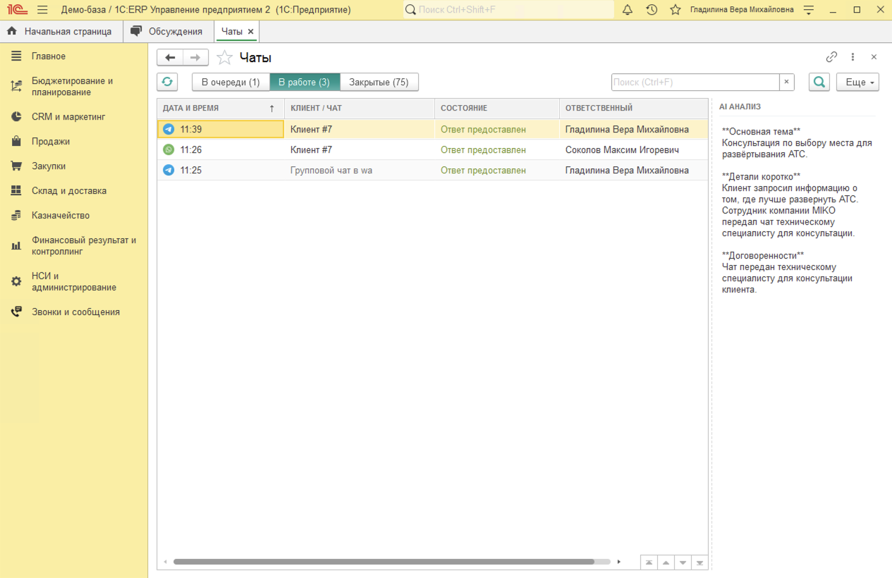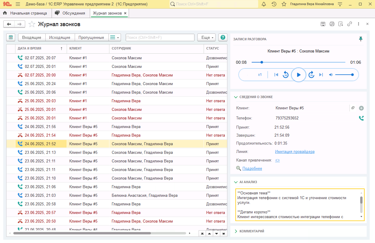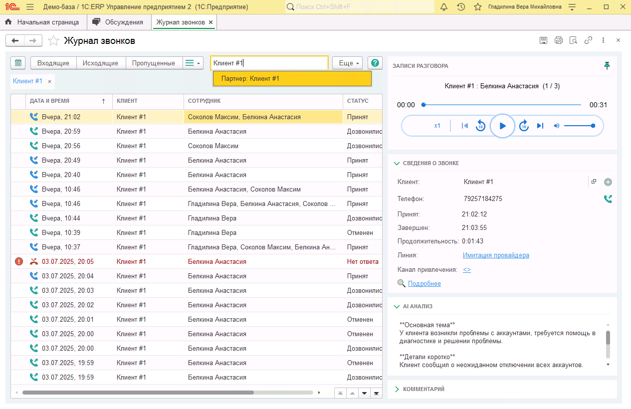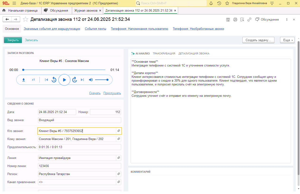 AI анализ позволяет быстро ознакомиться с содержанием диалога без прослушивания записи. В блоке AI анализ в 1С:ERP доступен результат аи анализа разговоров, который содержит ключевые моменты диалога.