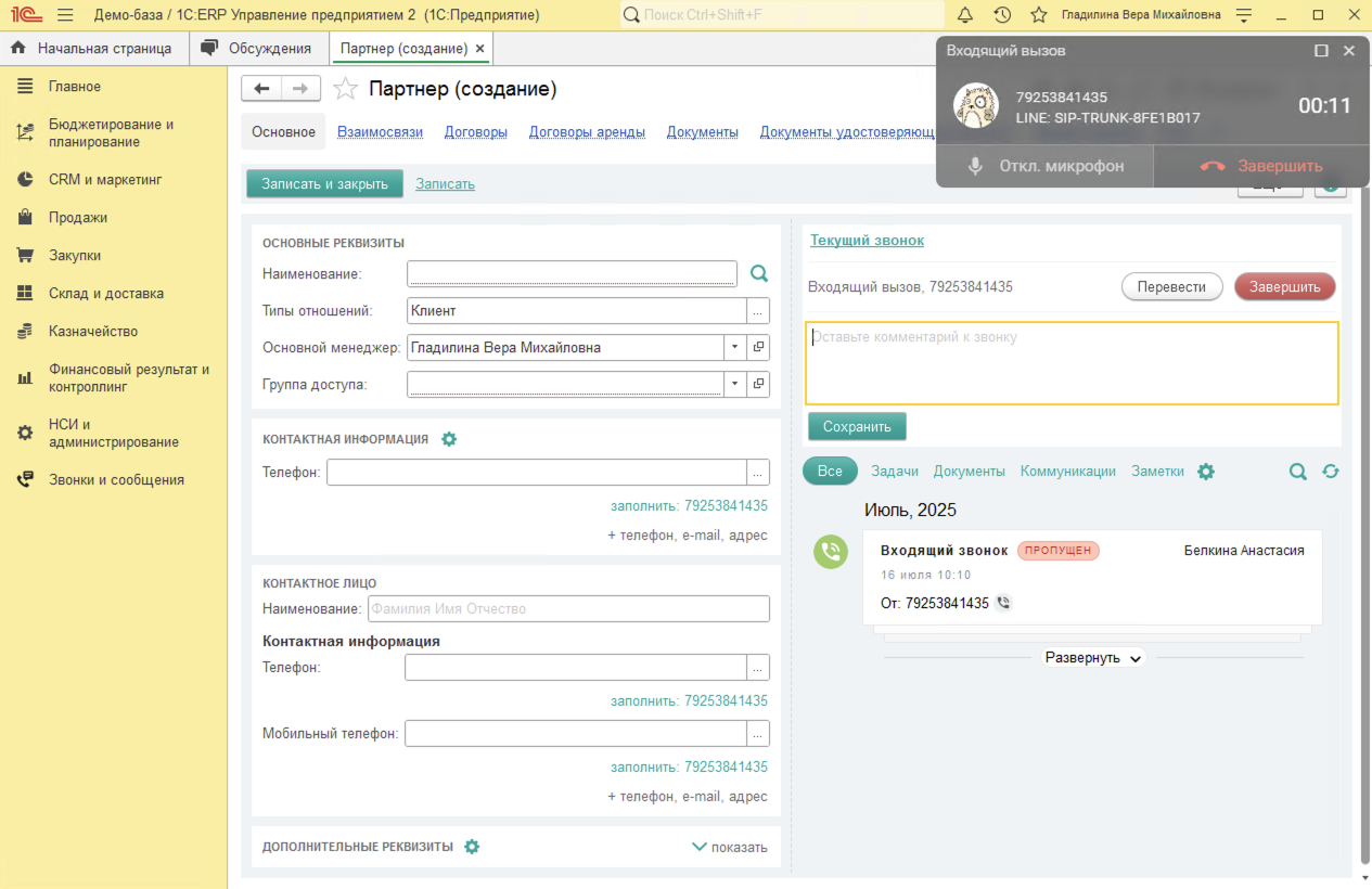 - При входящем звонке от неизвестного клиента, баннер показывает только номер телефона. При ответе на звонок в 1С открывается форма для создания нового клиента. В 1С:ERP также можно использовать помощник регистрации нового партнера.