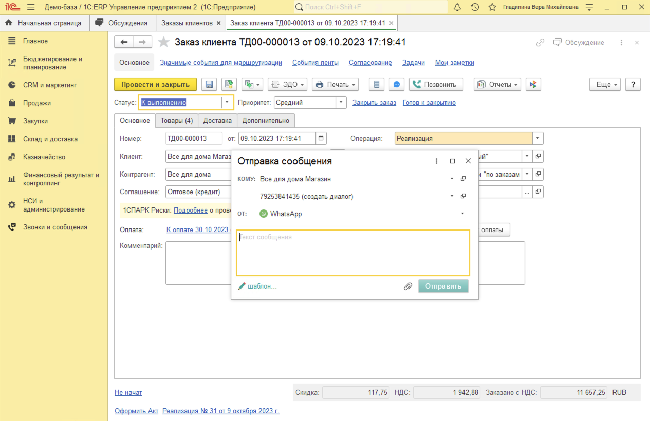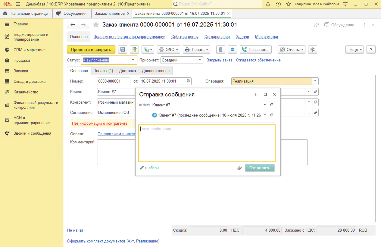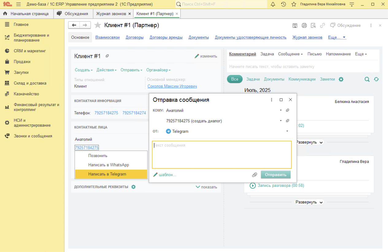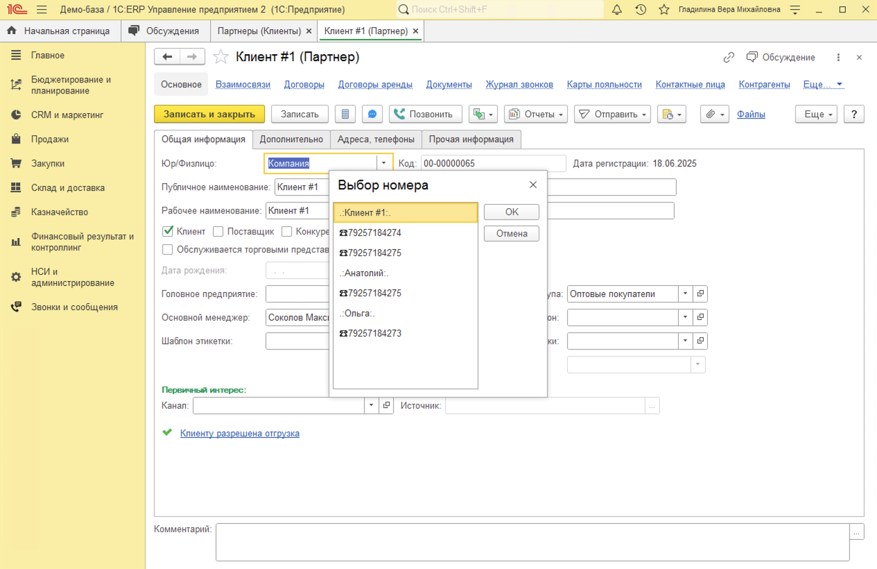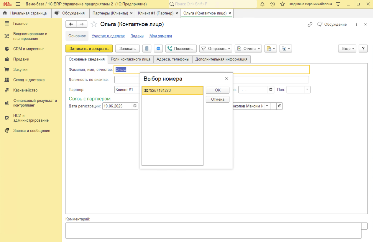 Исходящие звонки в 1С:ERP совершаются в один клик из карточки Партнера (Клиента), Контактного лица, Заказа клиента или документа Лента (доработанная Карточка клиента).