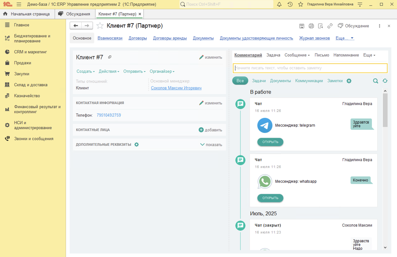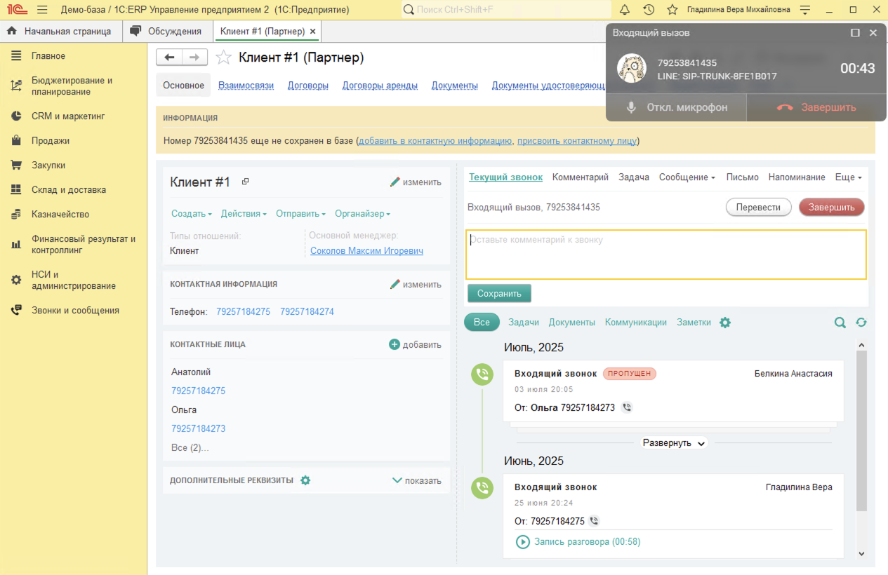 - Если звонит клиент, номер которого уже есть в базе, в баннере звонка отображается название организации. После ответа на звонок в 1С:ERP Управление предприятием автоматически открывается карточка клиента с историей всех взаимодействий (звонки, заказы, письма).