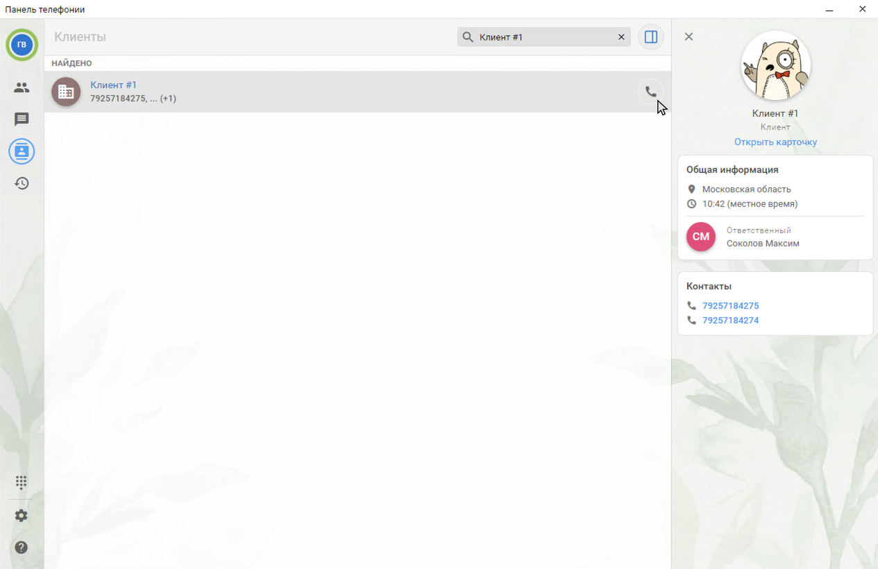 - Исходящий звонок может быть инициирован через строку умного поиска в Панели телефонии. При вводе в строку поиска номера телефона, имени клиента или контактного лица система отобразит подходящие варианты из базы 1С:ERP Управление предприятием. Для совершения звонка необходимо навести курсор на нужную строку и нажать на иконку телефонной трубки.