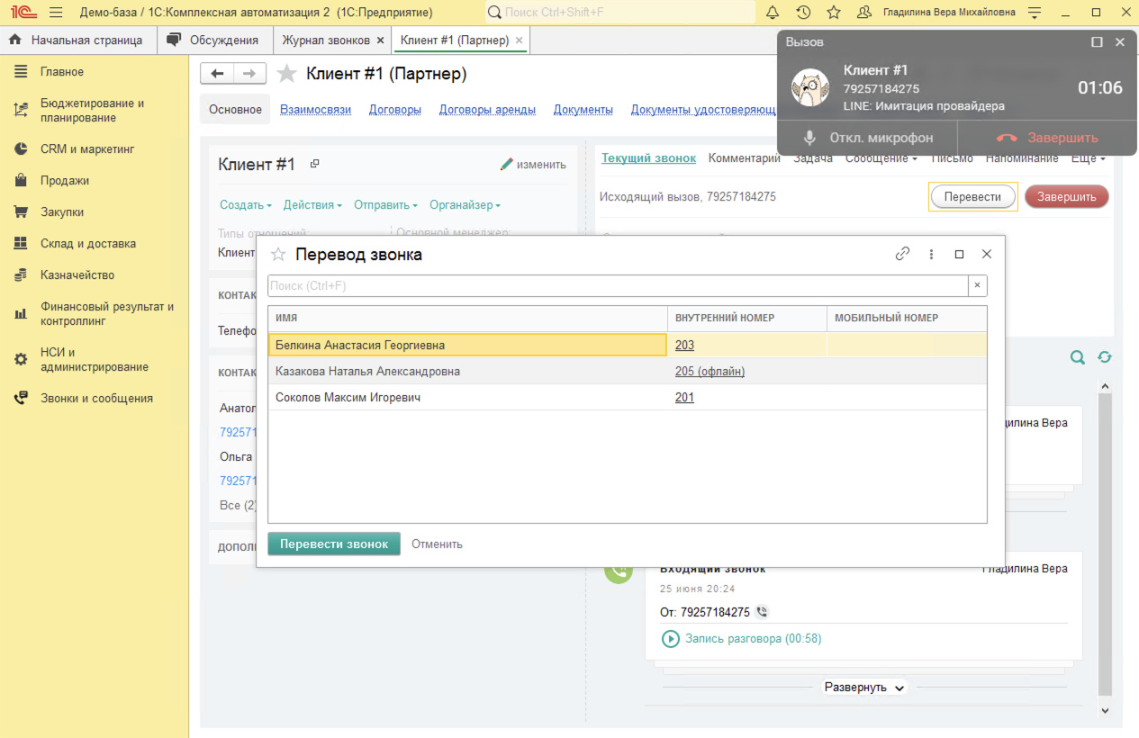 Перевод звонка другому сотруднику можно осуществить из Панели телефонии для 1С или из 1С:Комплексная автоматизация. При инициации перевода система отображает актуальный список сотрудников с указанием их текущего статуса доступности (онлайн/занят/не в сети), что позволяет оператору предварительно убедиться в возможности принятия вызова выбранным сотрудником перед выполнением перевода.