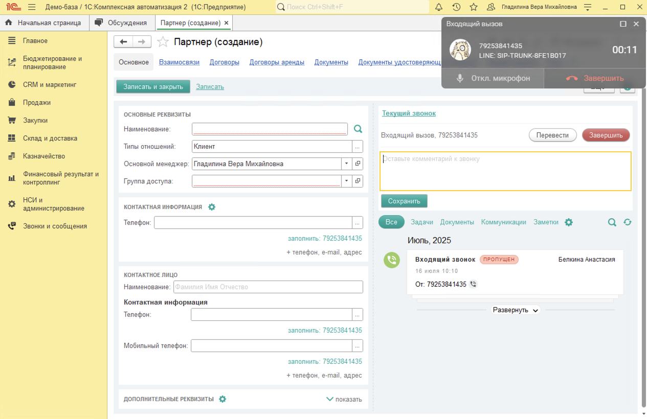 - При входящем звонке от неизвестного клиента, в баннере звонка отображается только номер телефона звонящего. При ответе на звонок в 1С: Комплексная автоматизация откроется карточка создания нового клиента в базе. В 1С:КА можно выбрать альтернативный вариант сохранения нового клиента - помощник регистрации нового партнера.