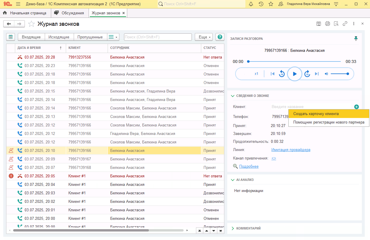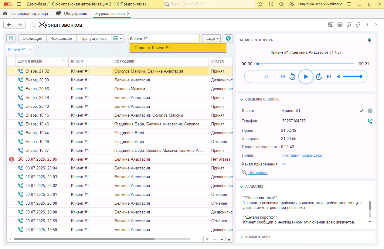 В Журнале звонков в 1С:Комплексная автоматизация фиксируются все входящие и исходящие вызовы компании. Каждый звонок отображается в виде строки таблицы, содержащей дату и время, имя клиента (или номер телефона, если клиент не зарегистрирован в базе), имена сотрудников-участников разговора, длительность разговора и статус вызова. Подробная информация по конкретному звонку доступна в разделе Сведения о звонке.