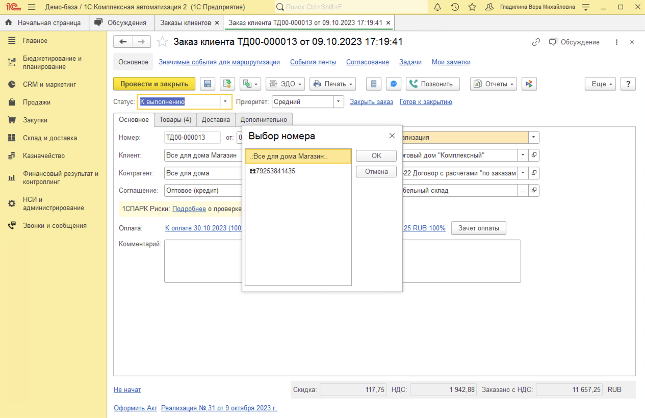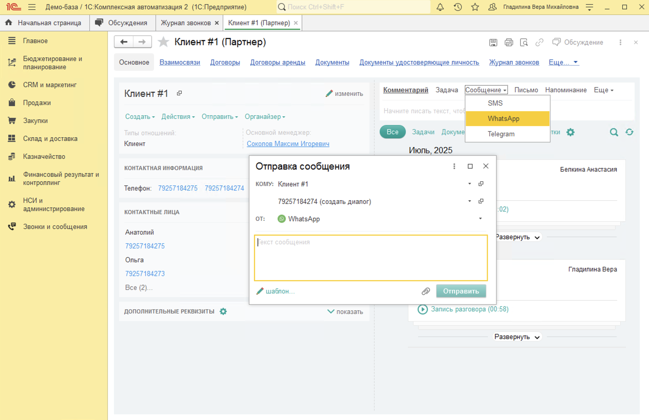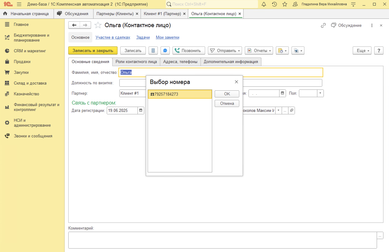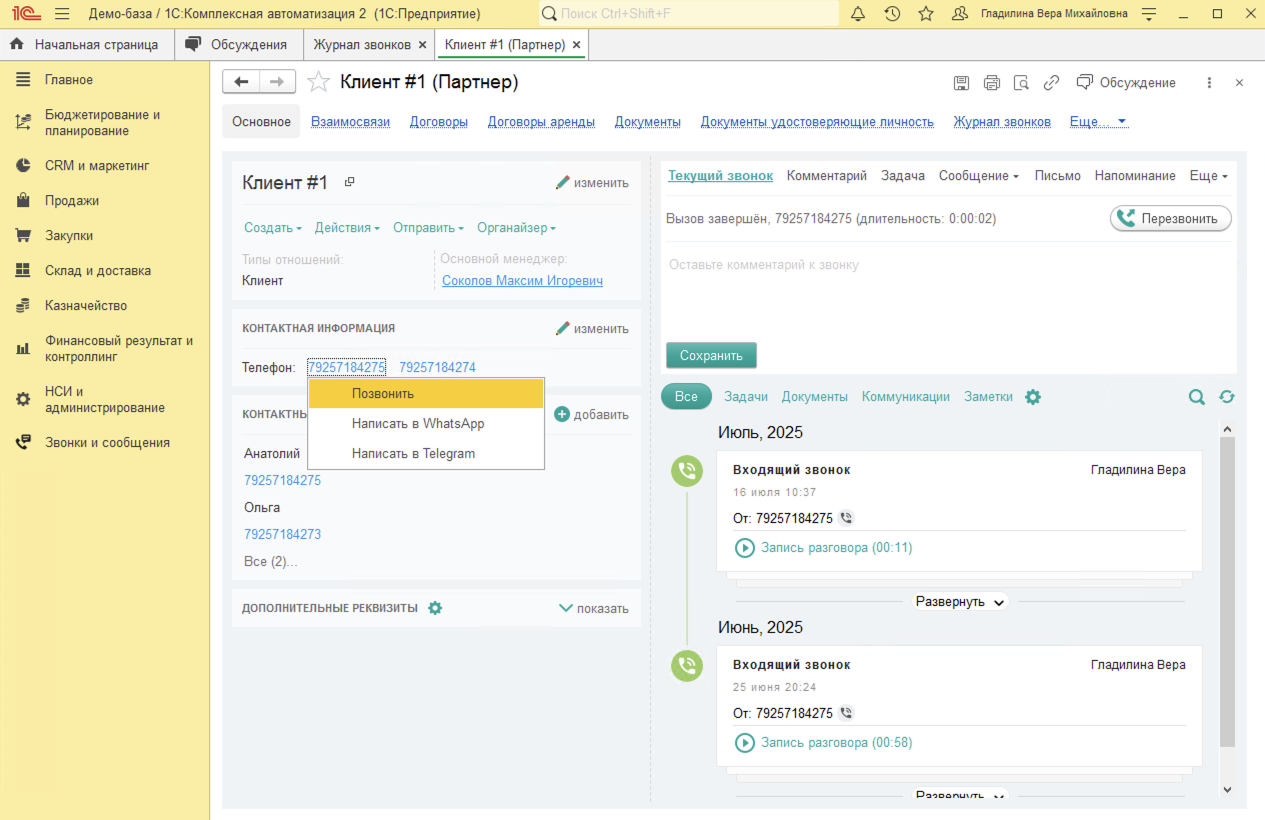 Исходящие звонки в 1С:Комплексная автоматизация совершаются всего в 1 клик из карточки Партнера (Клиента), карточки Контактного лица, Заказа клиента или документа Лента (доработанная Карточка клиента).