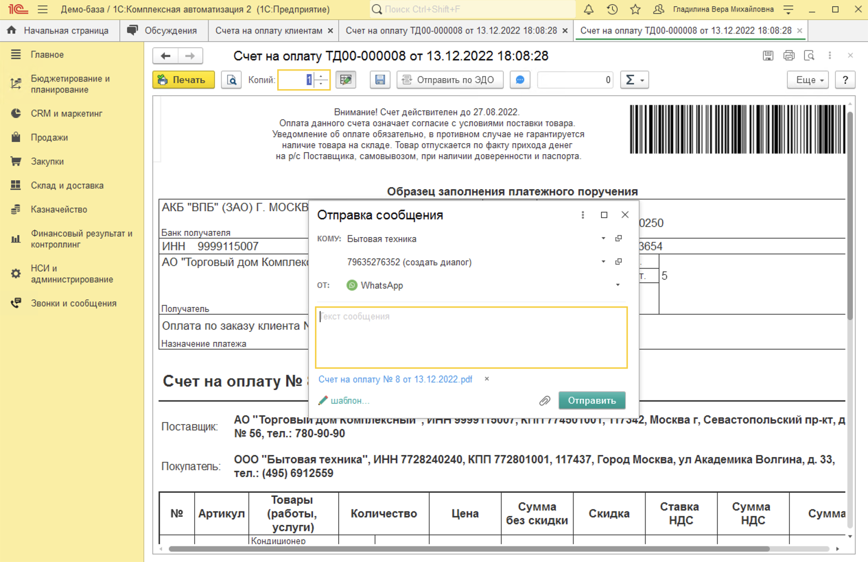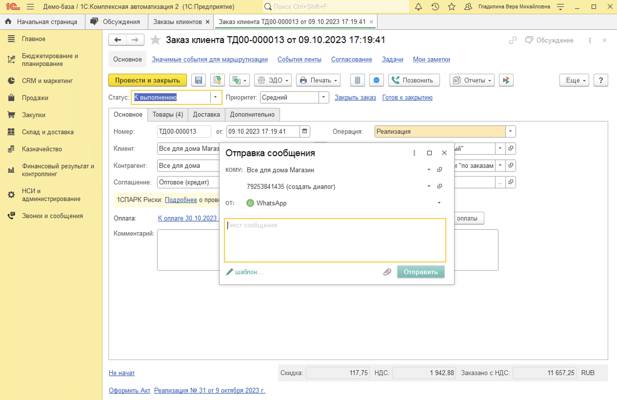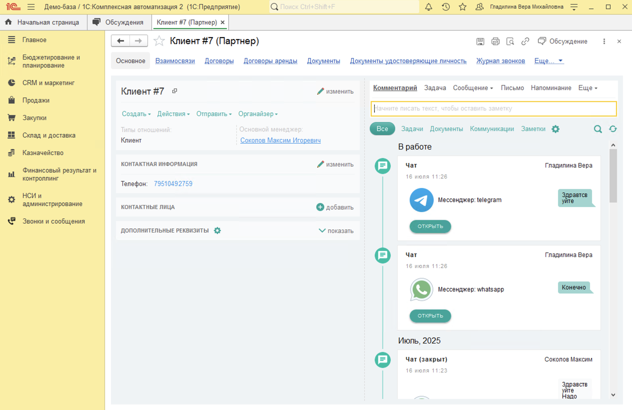 - При входящем звонке от клиента, номер которого уже есть в базе, название клиента отображается в баннере звонка. При ответе на звонок в 1С:Комплексная автоматизация автоматически откроется карточка клиента с полной историей взаимодействий (звонки, заказы, письма).