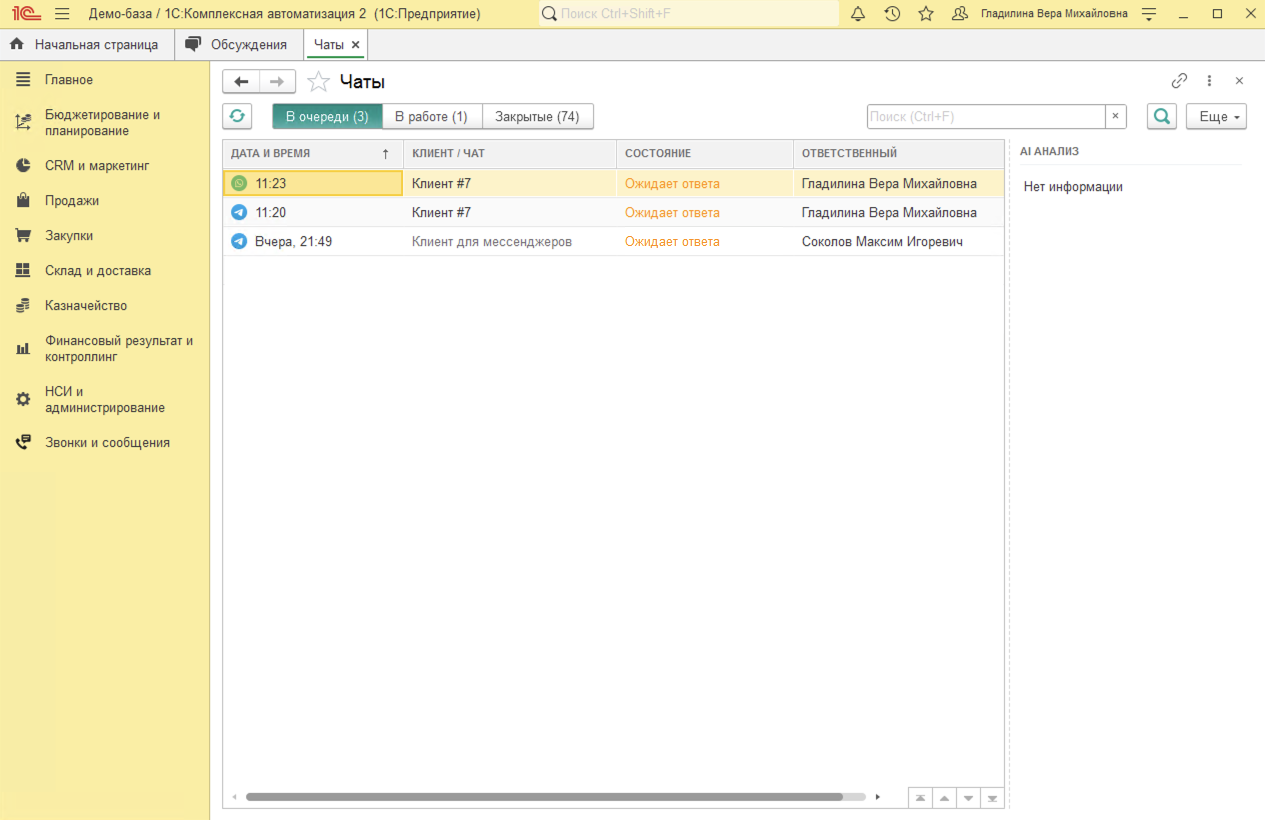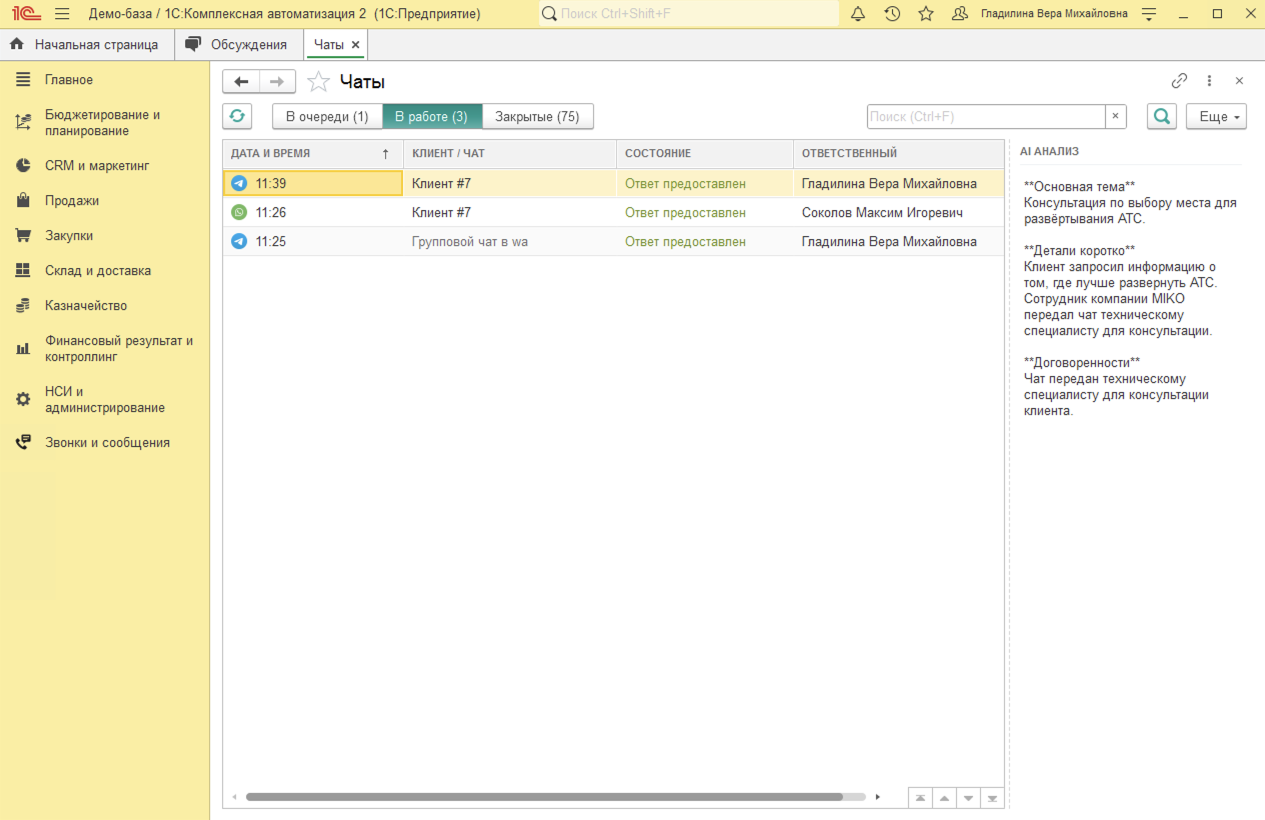 В блоке AI анализ в 1С:КА доступен результат аи анализа разговоров, который содержит ключевые моменты диалога. Функционал предназначен для оперативного ознакомления с содержанием звонков без необходимости прослушивания аудиозаписей.