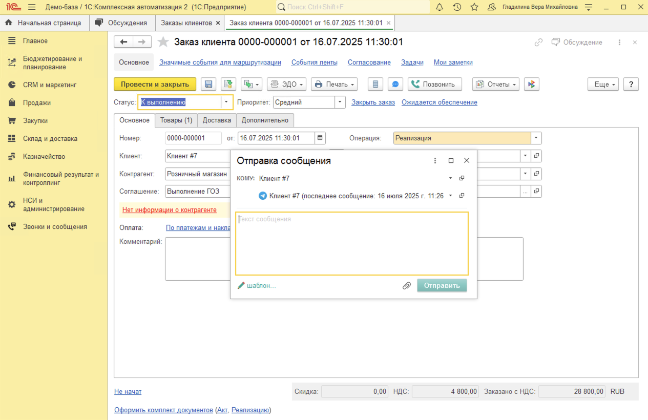 - Исходящие звонки из Заказа клиента инициируются нажатием кнопки Позвонить в командной панели. При установлении соединения с клиентом система автоматически открывает карточку клиента с полной историей взаимодействий.