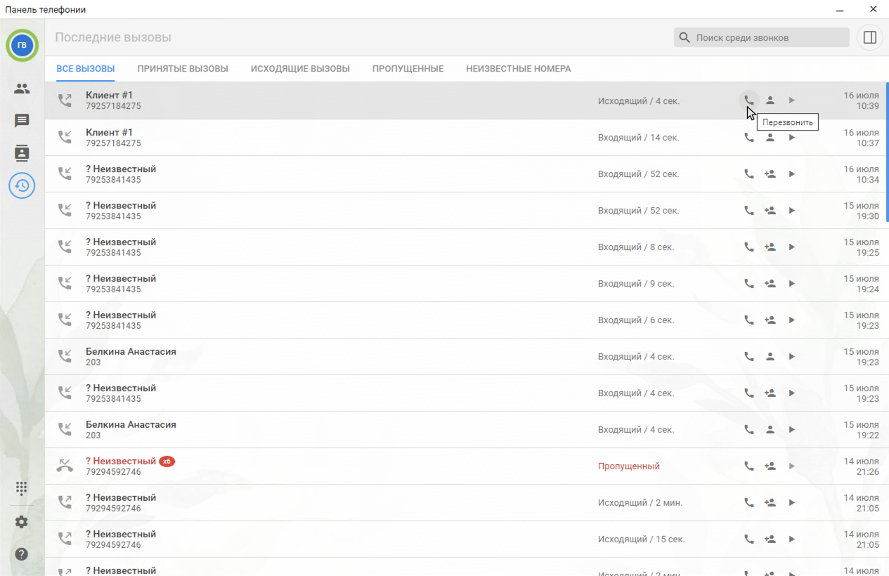 - Исходящий звонок из истории звонков в Панели телефонии совершается путем нажатия на иконку телефонной трубки.