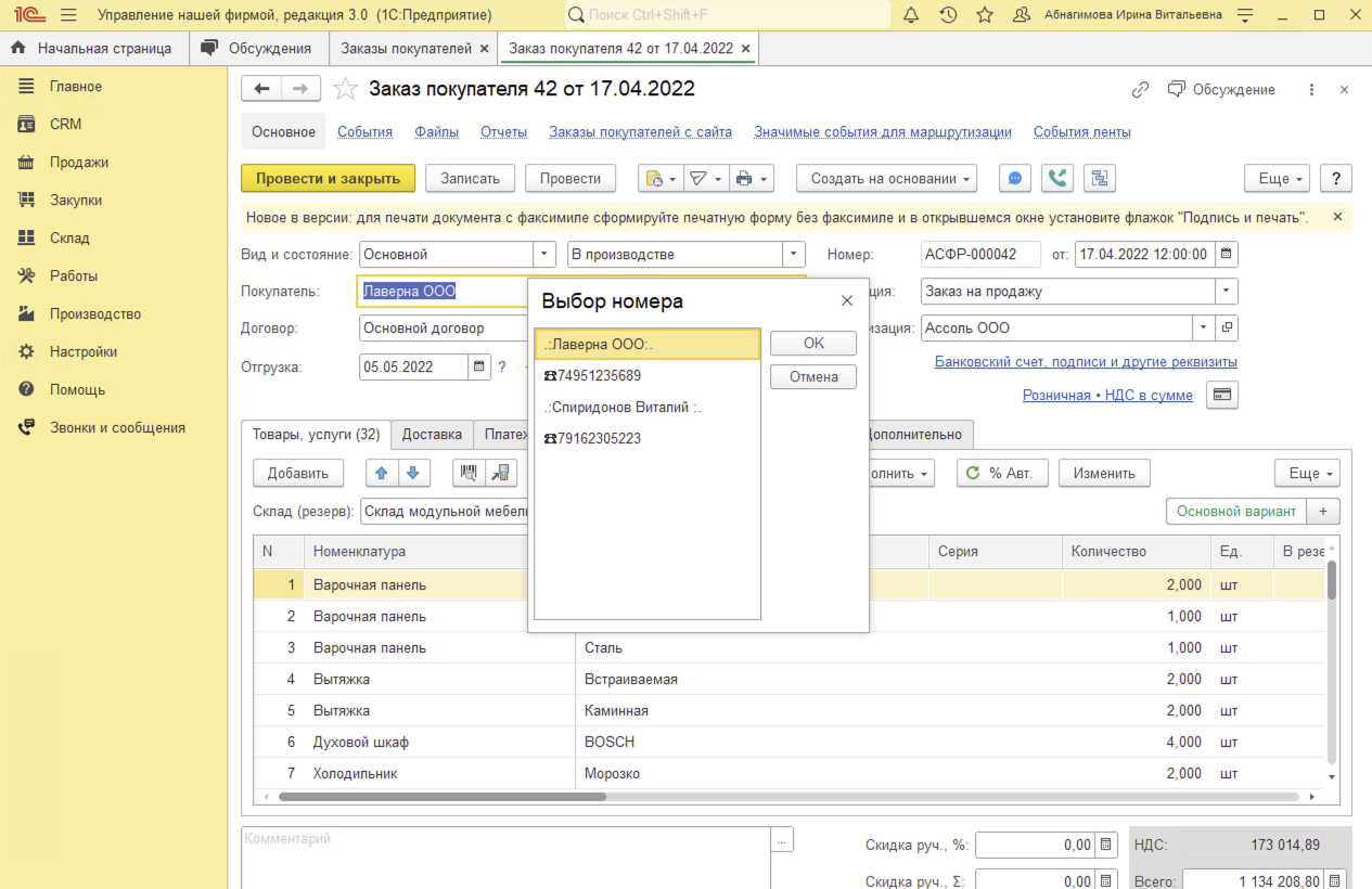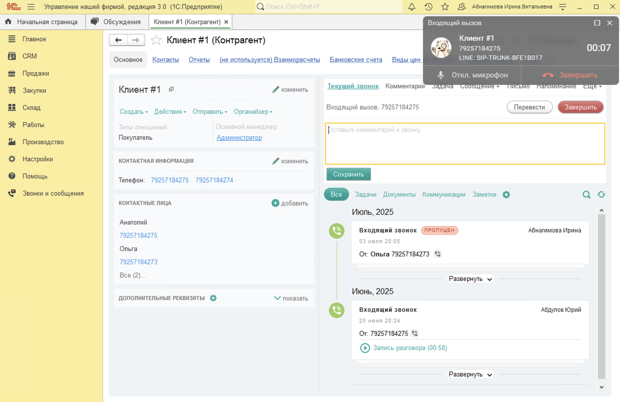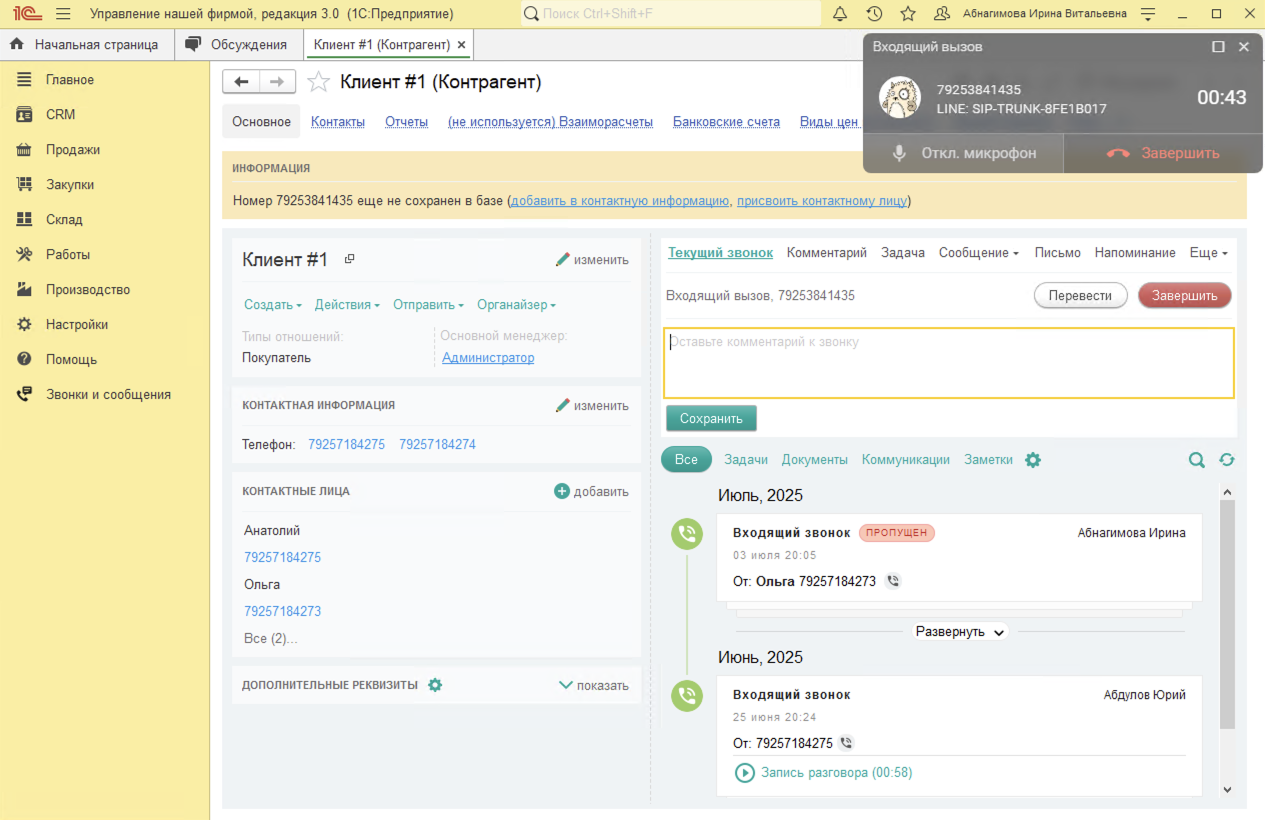 - При входящем звонке от клиента, номер которого уже сохранен в базе, название клиента отображается в баннере звонка. После принятия звонка в 1С:Управление нашей фирмой автоматически открывается карточка клиента с полной историей взаимодействий (звонками, заказами и письмами) либо карточка лида.