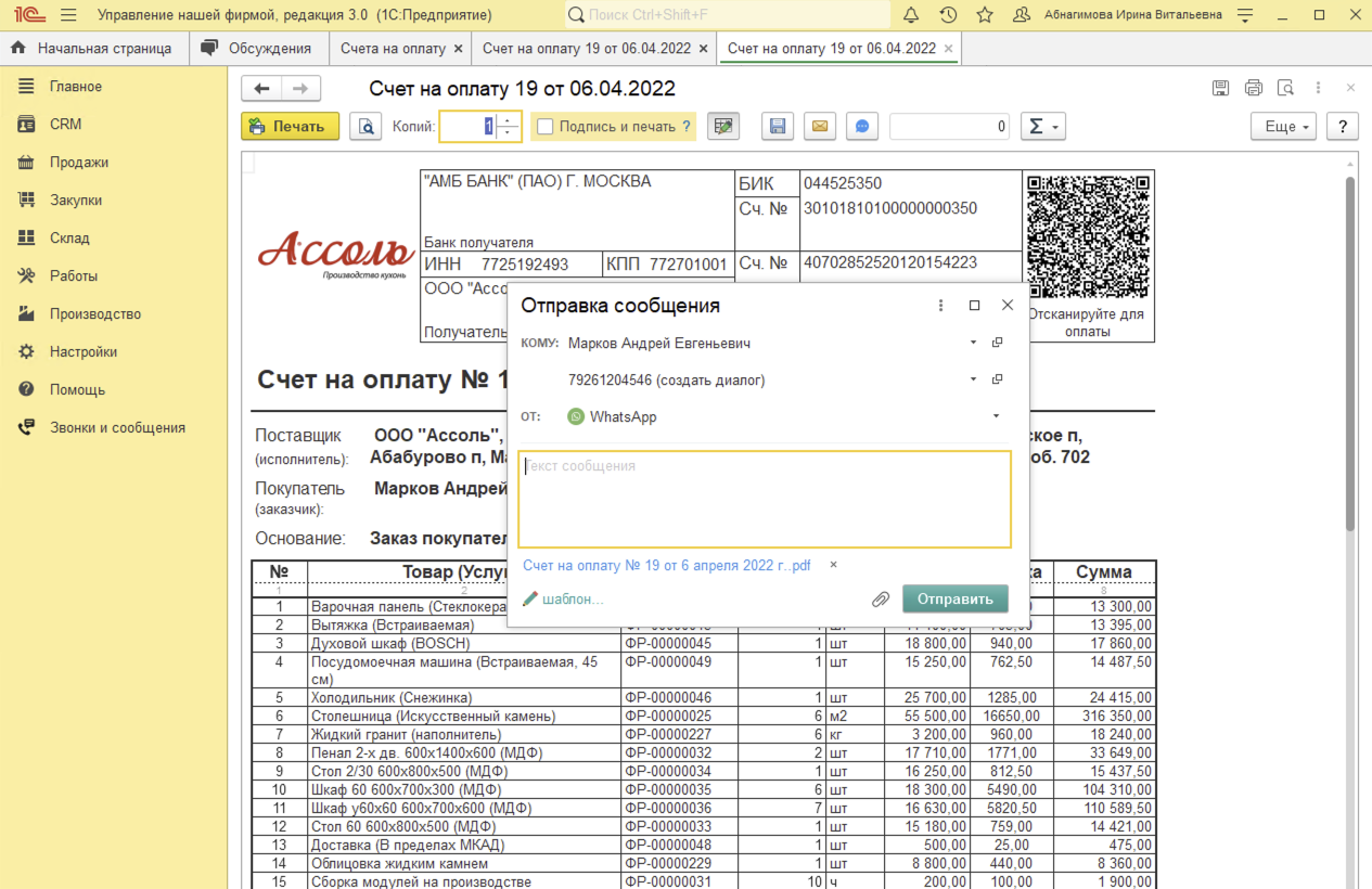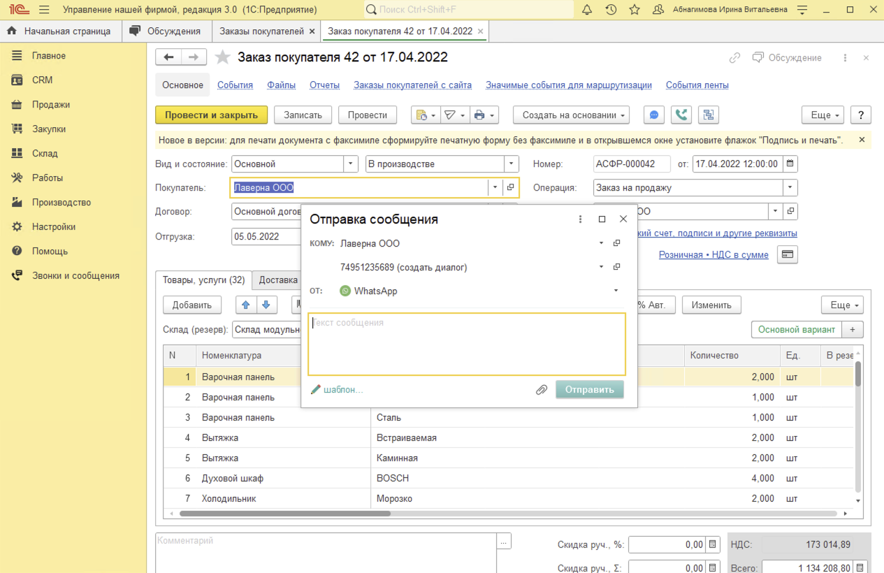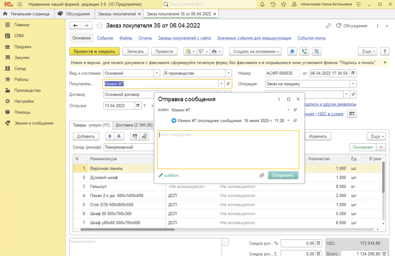 - При входящем звонке от клиента, номер которого уже сохранен в базе, название клиента отображается в баннере звонка. После принятия звонка в 1С:Управление нашей фирмой автоматически открывается карточка клиента с полной историей взаимодействий (звонками, заказами и письмами) либо карточка лида.