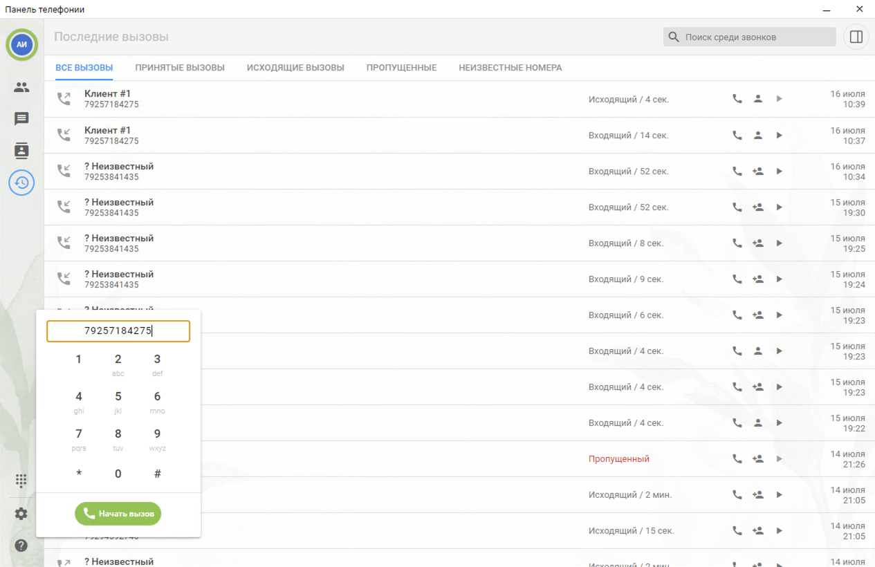 - Исходящий звонок из истории звонков в Панели телефонии совершается одним нажатием на иконку телефонной трубки в строке записи звонка.