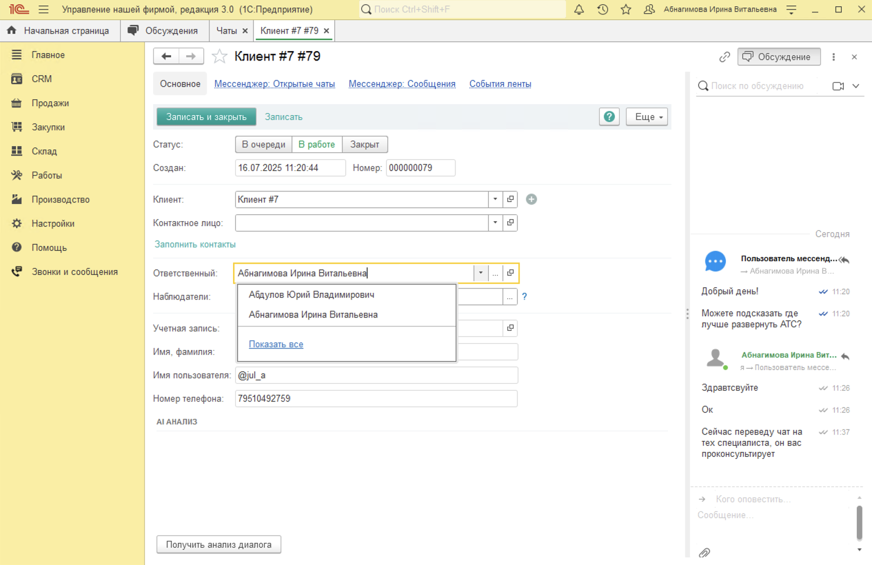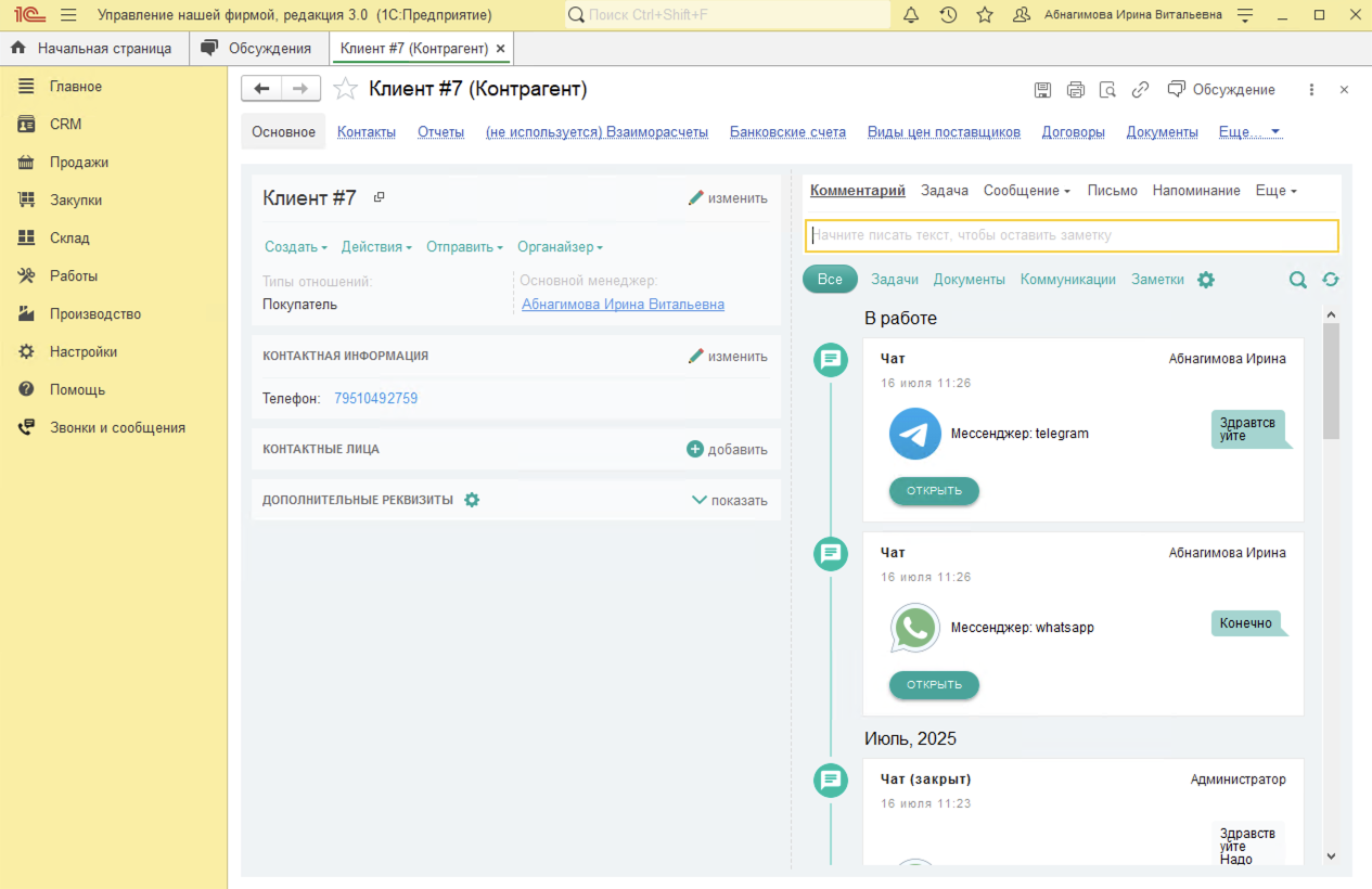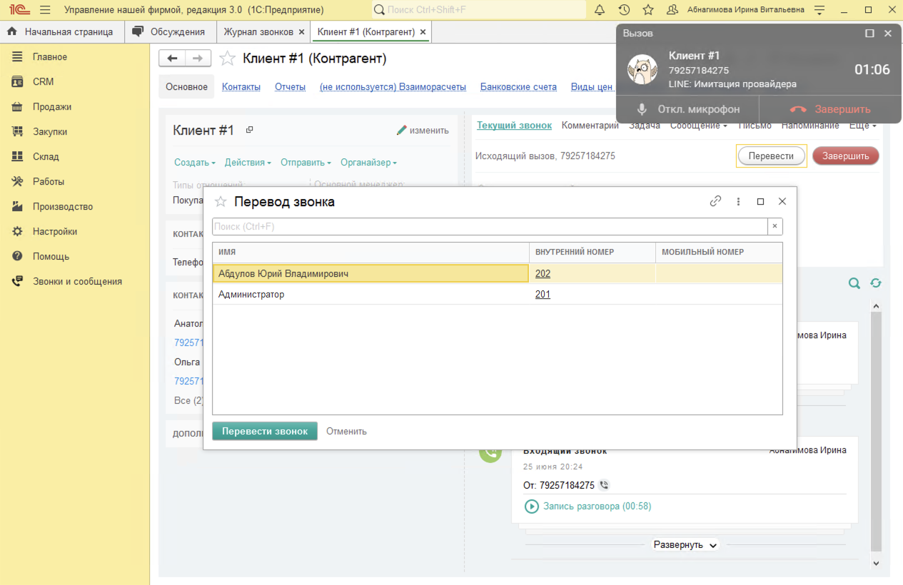 Панель телефонии позволяет совершать и принимать звонки даже при закрытой 1С:Управление нашей фирмой. Если база 1С:УНФ открыта, то при ответе клиента система автоматически откроет карточку клиента с полной историей взаимодействий либо карточка лида.
