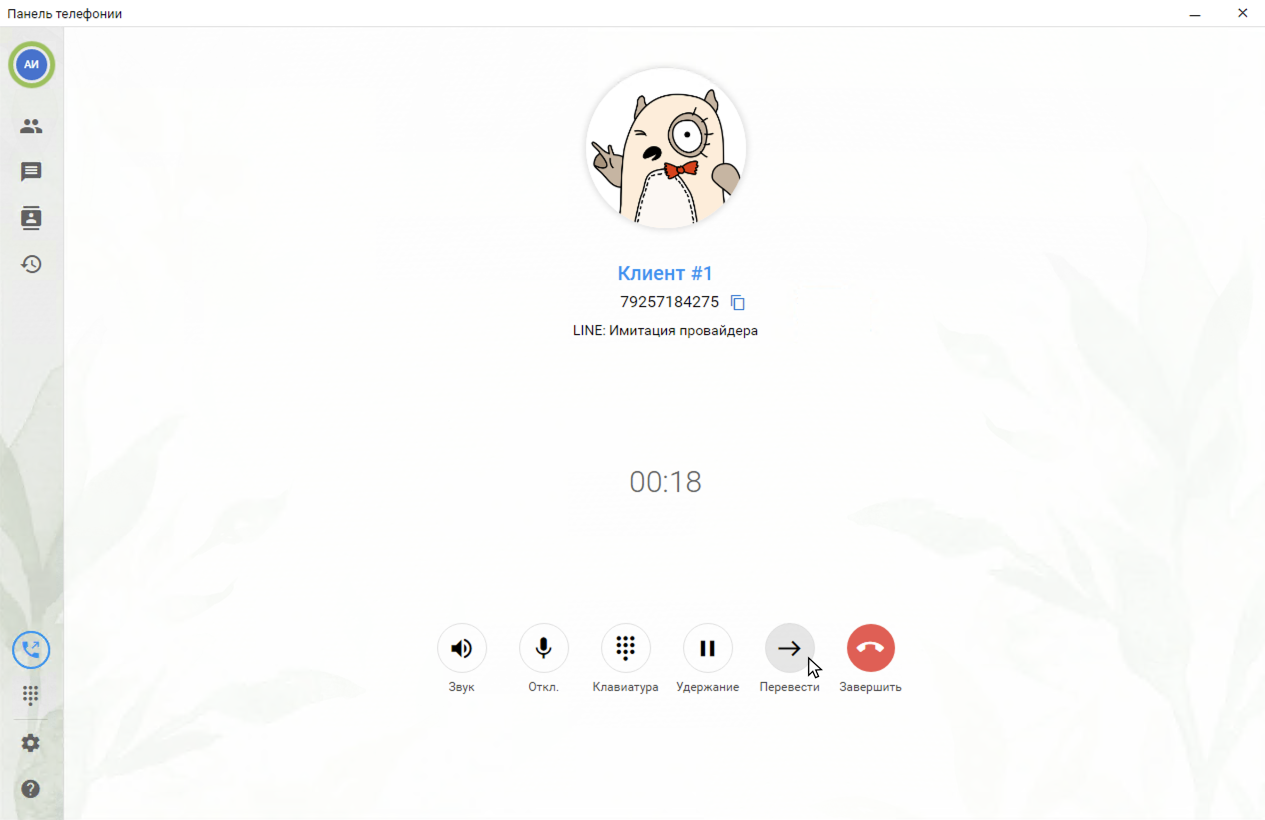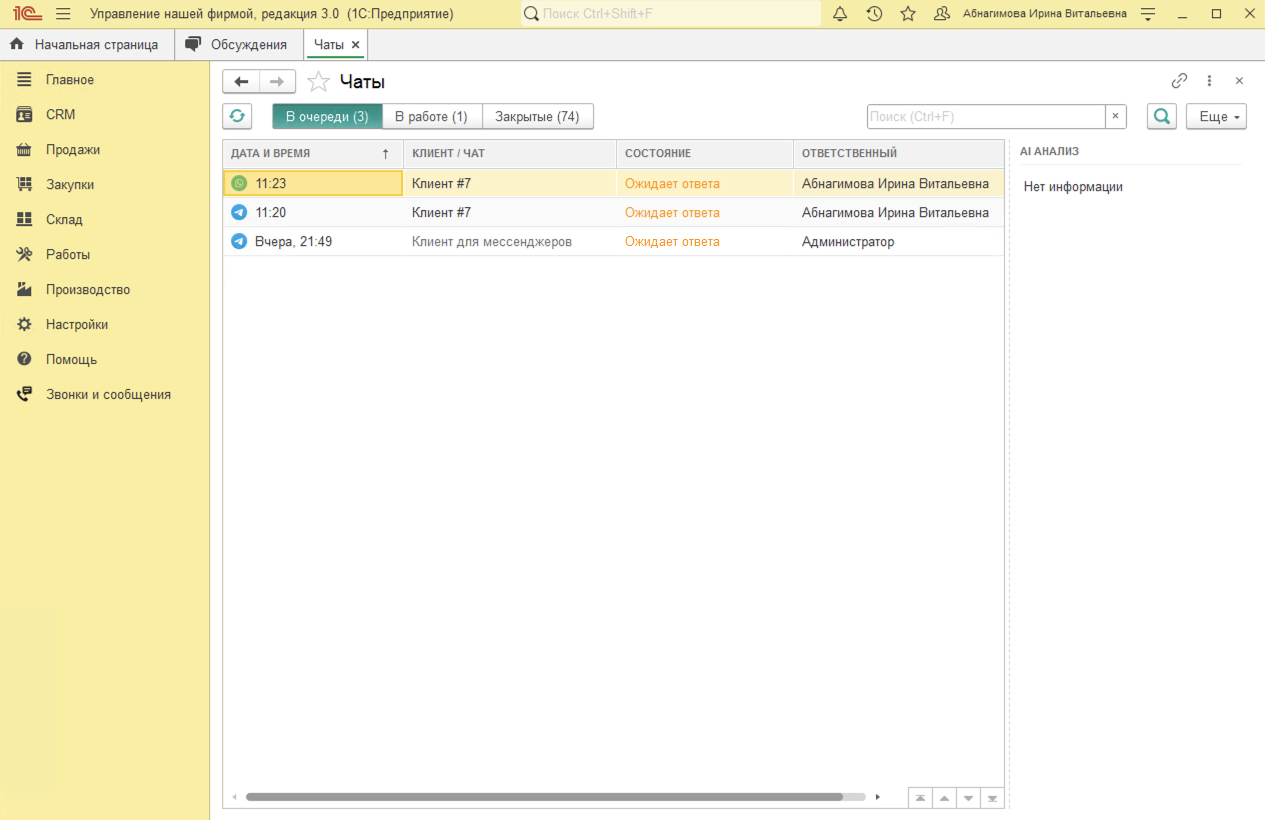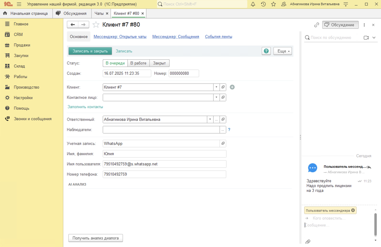 Панель телефонии позволяет совершать и принимать звонки даже при закрытой 1С:Управление нашей фирмой. Если база 1С:УНФ открыта, то при ответе клиента система автоматически откроет карточку клиента с полной историей взаимодействий либо карточка лида.