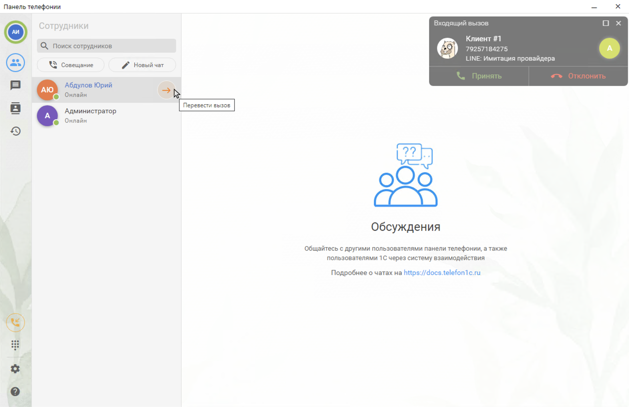 Перевод звонка на другого сотрудника можно выполнить как из Панели телефонии для 1С, так и напрямую из 1С:Управление нашей фирмой. При начале перевода система отображает актуальный список сотрудников с их текущим статусом доступности (онлайн/занят/не в сети), что позволяет оператору убедиться, что выбранный сотрудник сможет принять вызов.