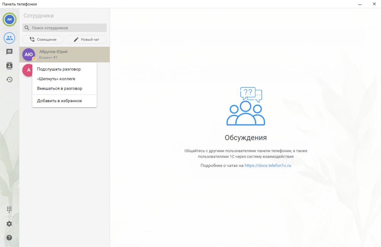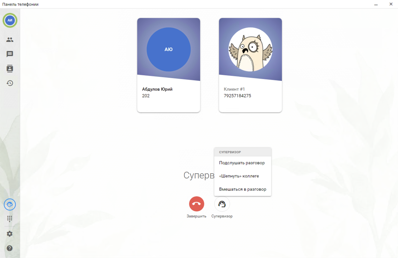 В Панели телефонии для 1С реализована функция супервизора, позволяющая подключаться к активным звонкам в одном из трех режимов: