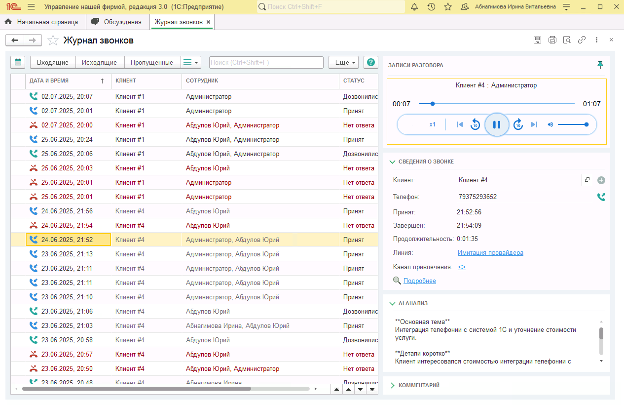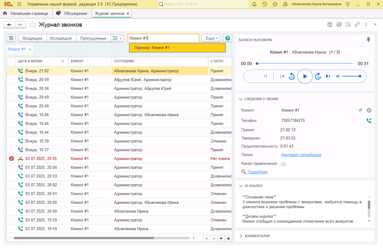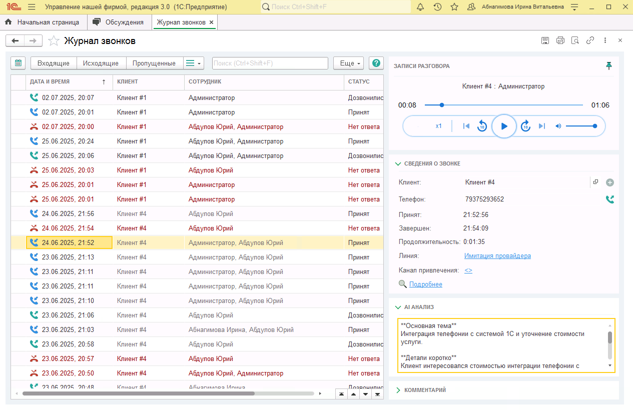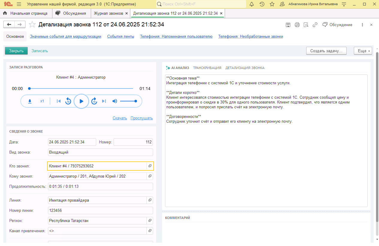 В блоке AI анализ в 1С:УНФ отображаются результаты ии анализа разговоров, который содержит ключевые моменты диалога и основные темы общения. Этот функционал позволяет быстро ознакомиться с содержанием звонка без необходимости прослушивания аудиозаписи.
