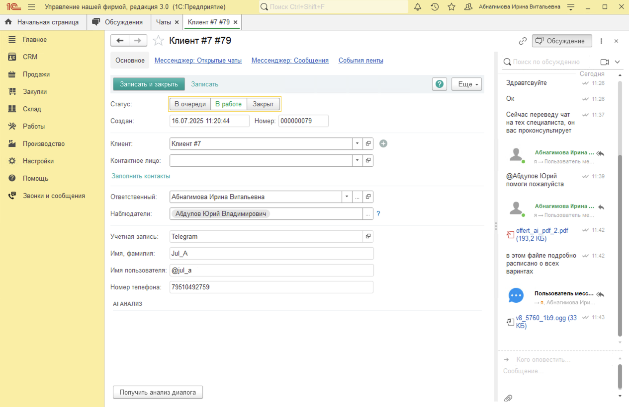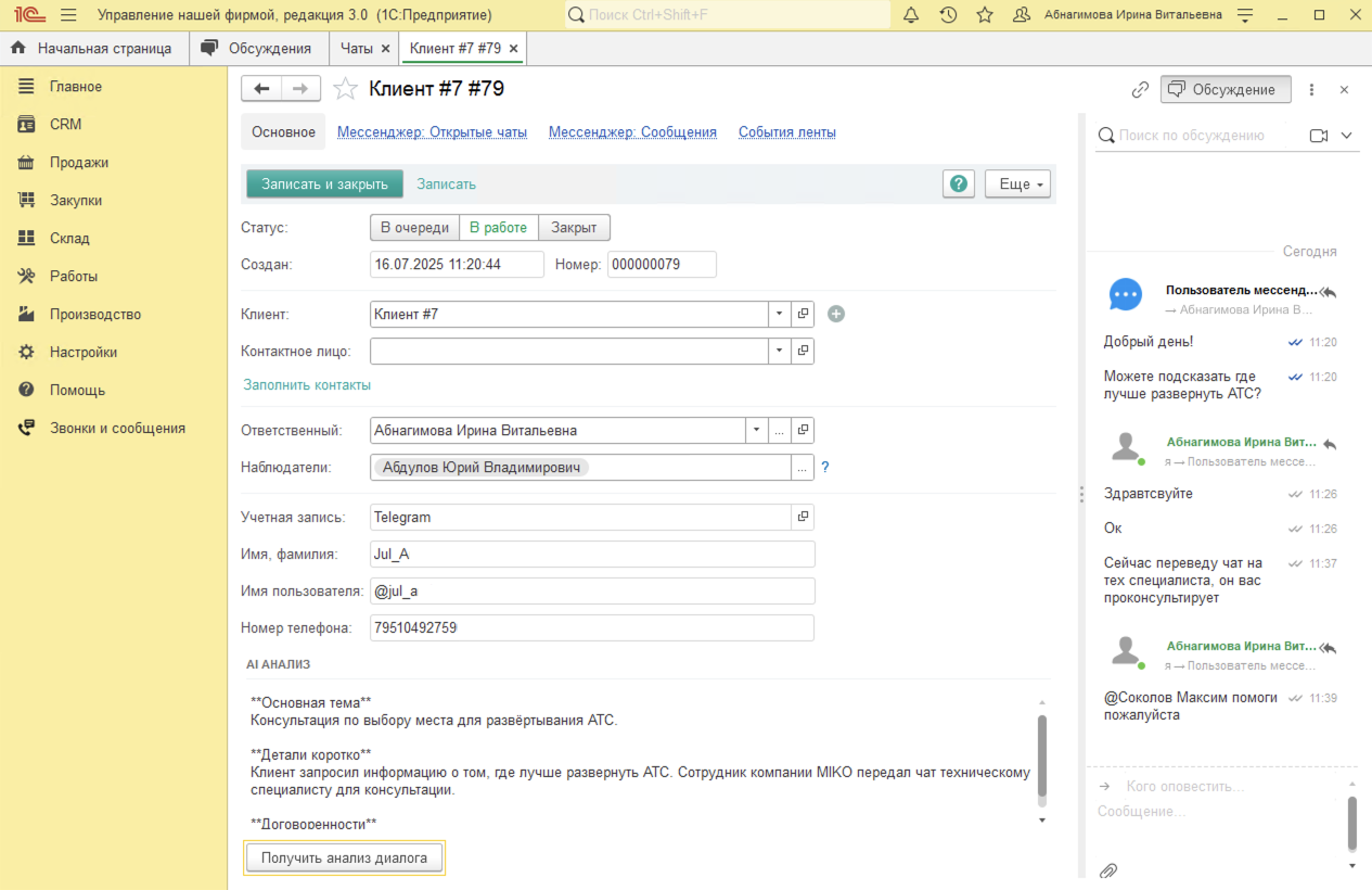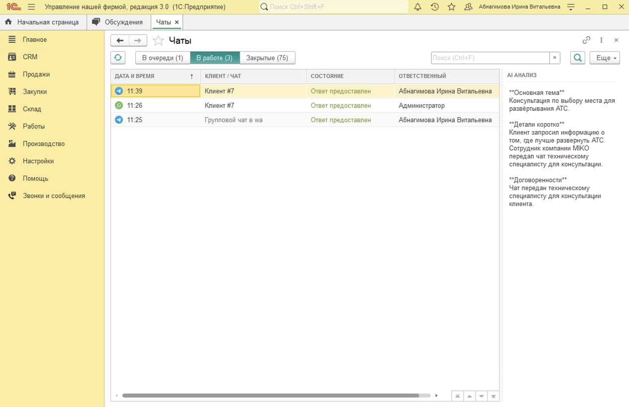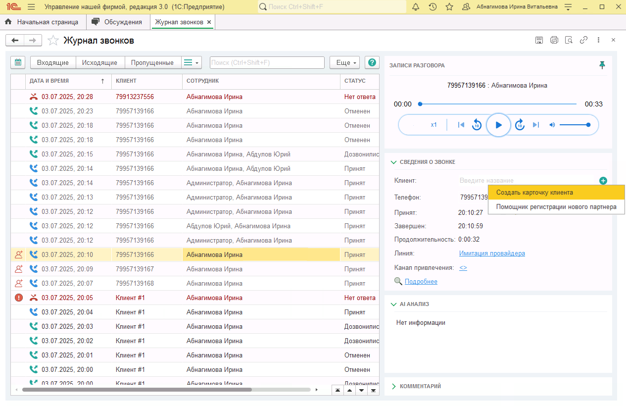 В блоке AI анализ в 1С:УНФ отображаются результаты ии анализа разговоров, который содержит ключевые моменты диалога и основные темы общения. Этот функционал позволяет быстро ознакомиться с содержанием звонка без необходимости прослушивания аудиозаписи.