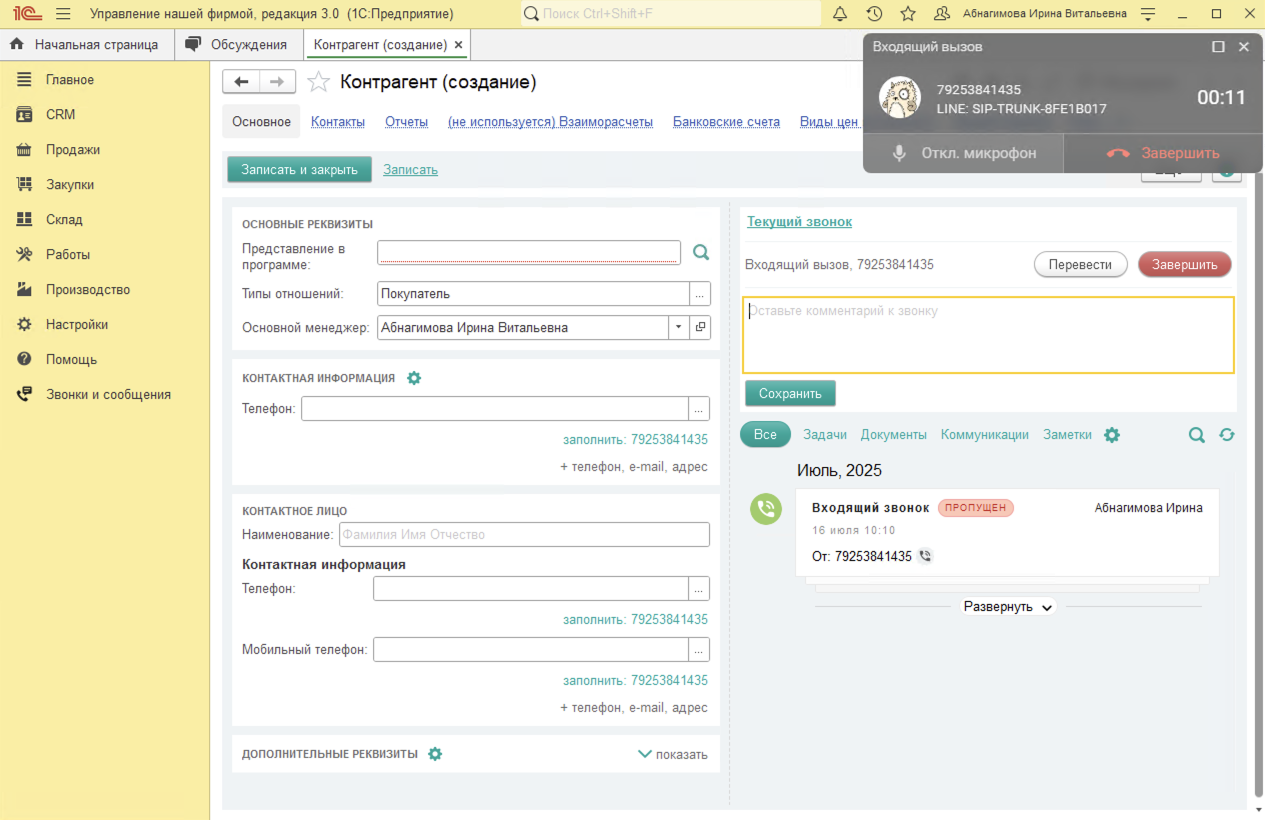 - Если поступает звонок от неизвестного клиента, в баннере звонка отображается только номер телефона. После принятия вызова в 1С:Управление нашей фирмой откроется карточка создания нового клиента в базе или новая карточка лида для сохранения обращения в базе.