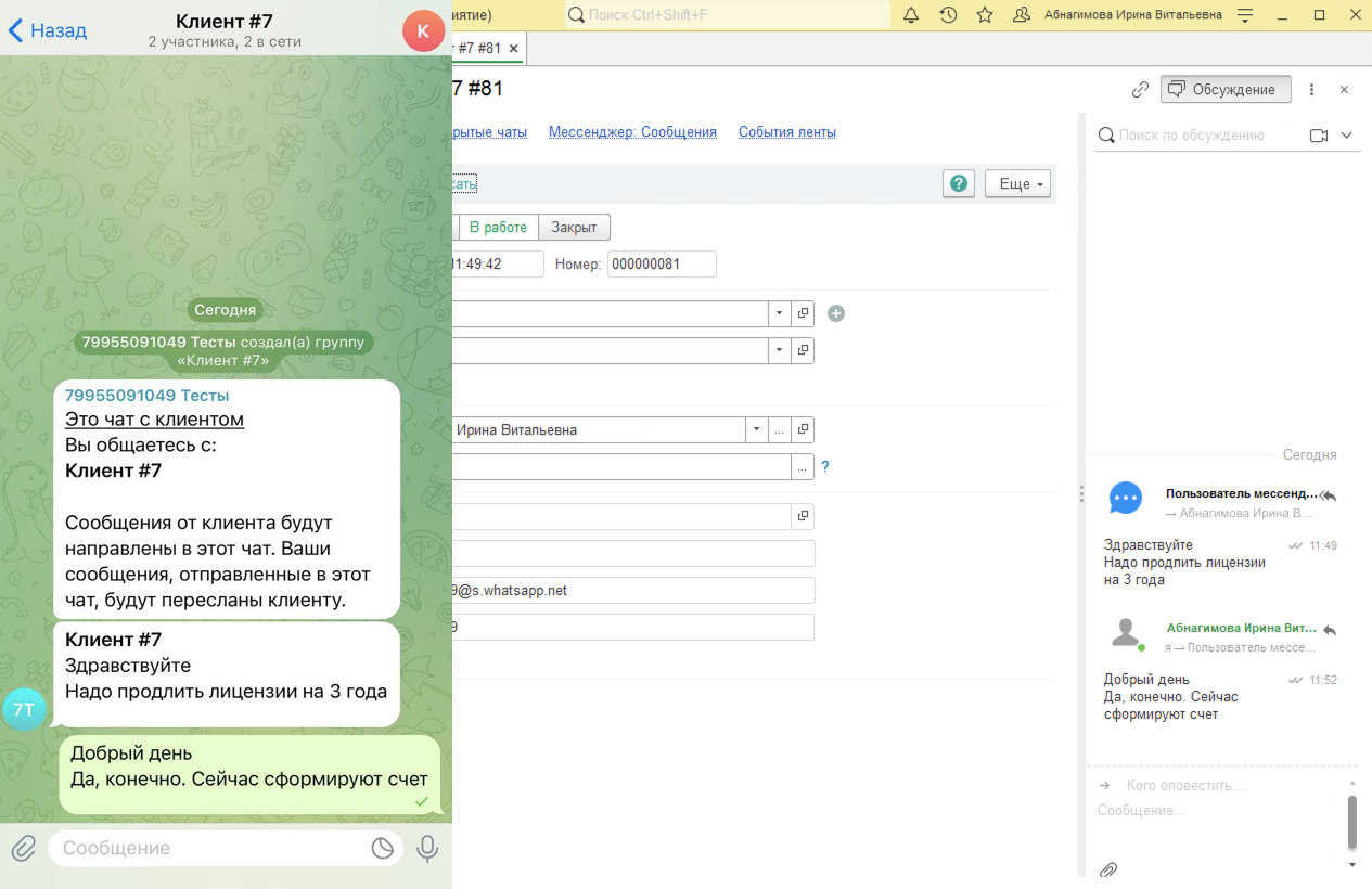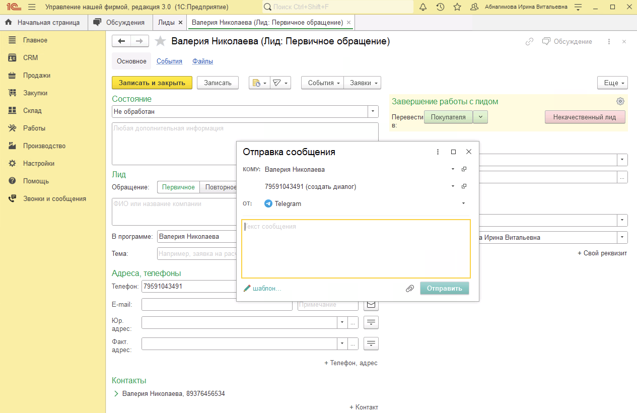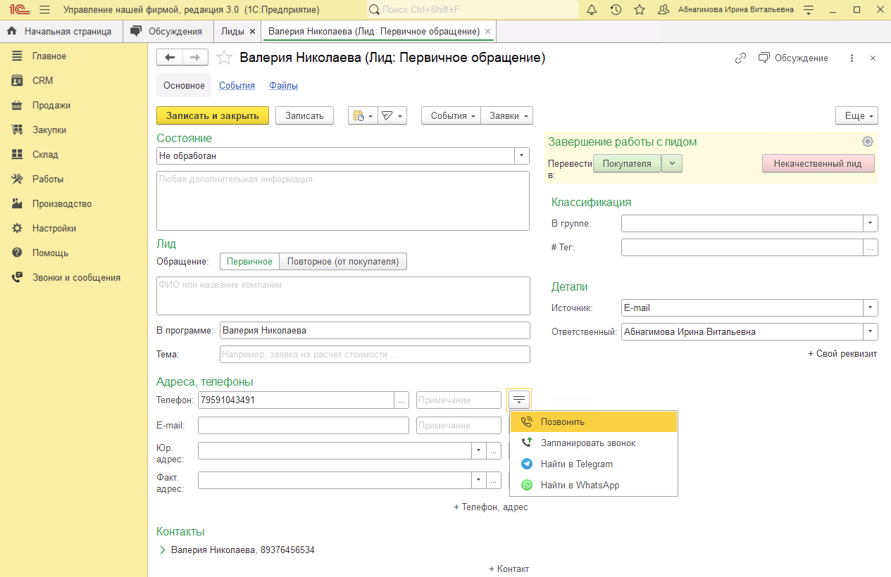 Мы учли оба подхода и реализовали возможность автоматического открытия карточки лида или карточки клиента при входящем звонке, а также регистрации новых обращений путем создания нового лида или клиента. Доработали карточку лида, теперь из неё можно позвонить в один клик, а также написать клиенту в мессенджеры WhatsApp или Telegram.