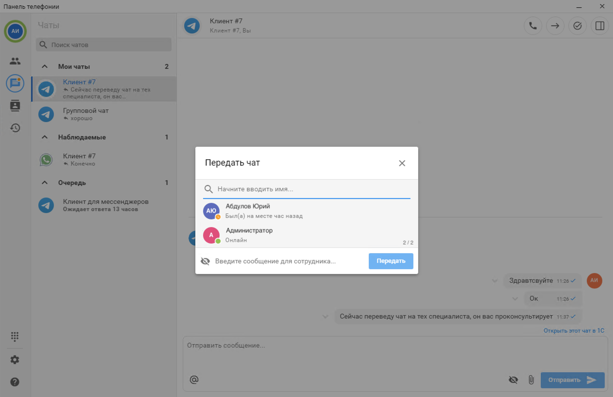 - Консультативный перевод звонка через список сотрудников в Панели телефонии. Нажмите кнопку Перевод рядом с нужным сотрудником, клиент переводится в режим удержания, а инициатор перевода соединяется с коллегой. После завершения разговора система автоматически соединяет клиента с целевым сотрудником без разрыва соединения.