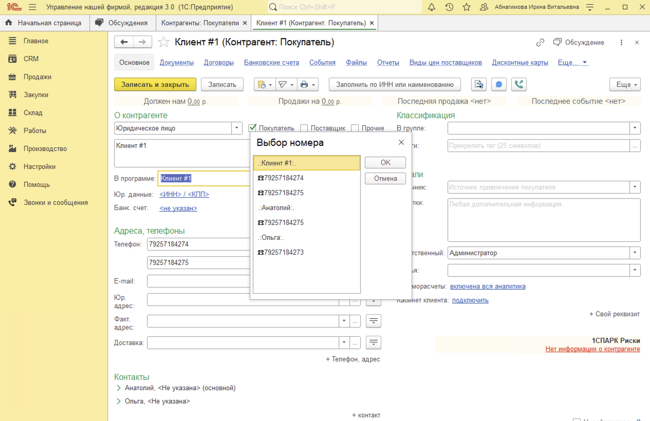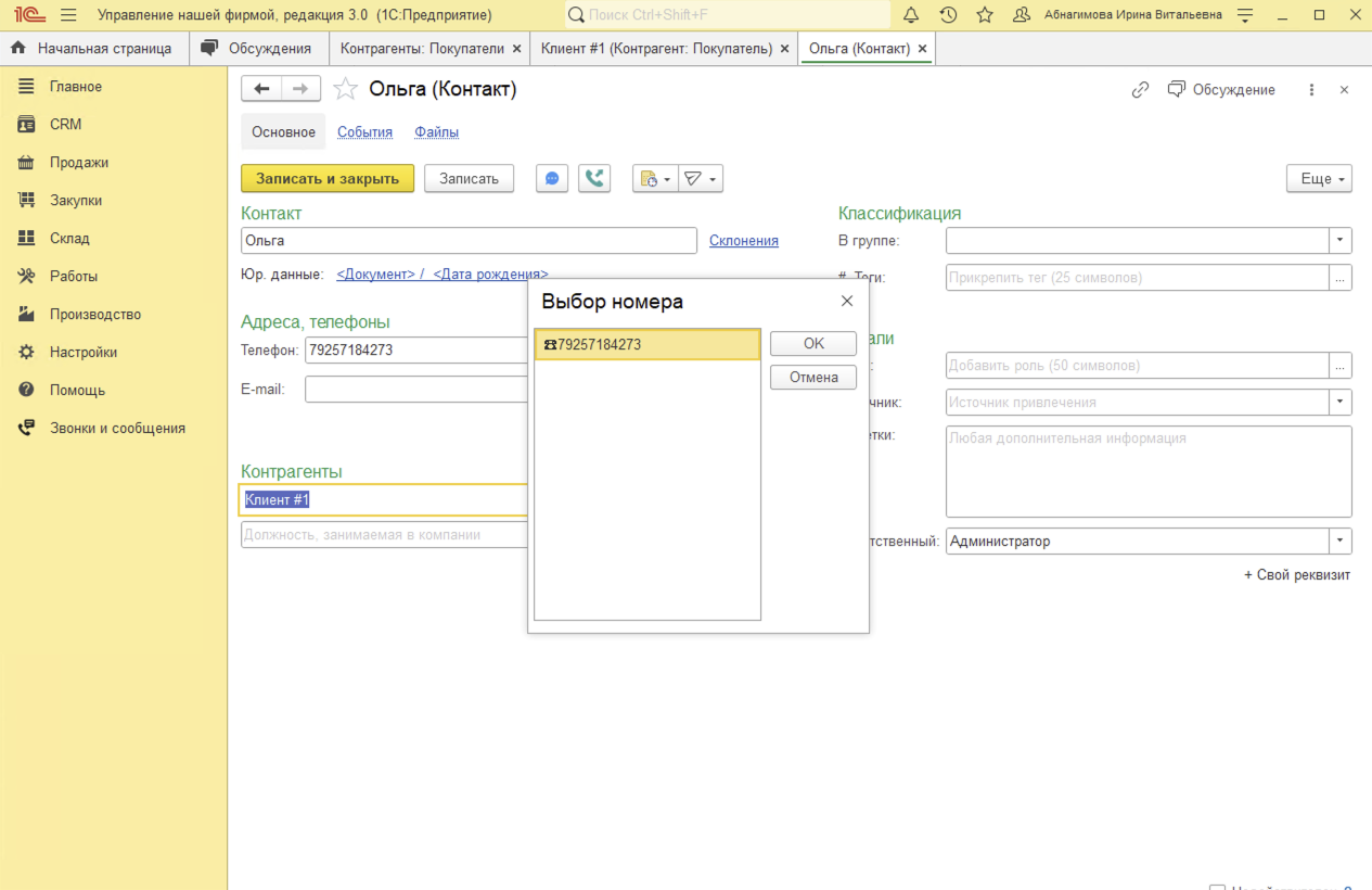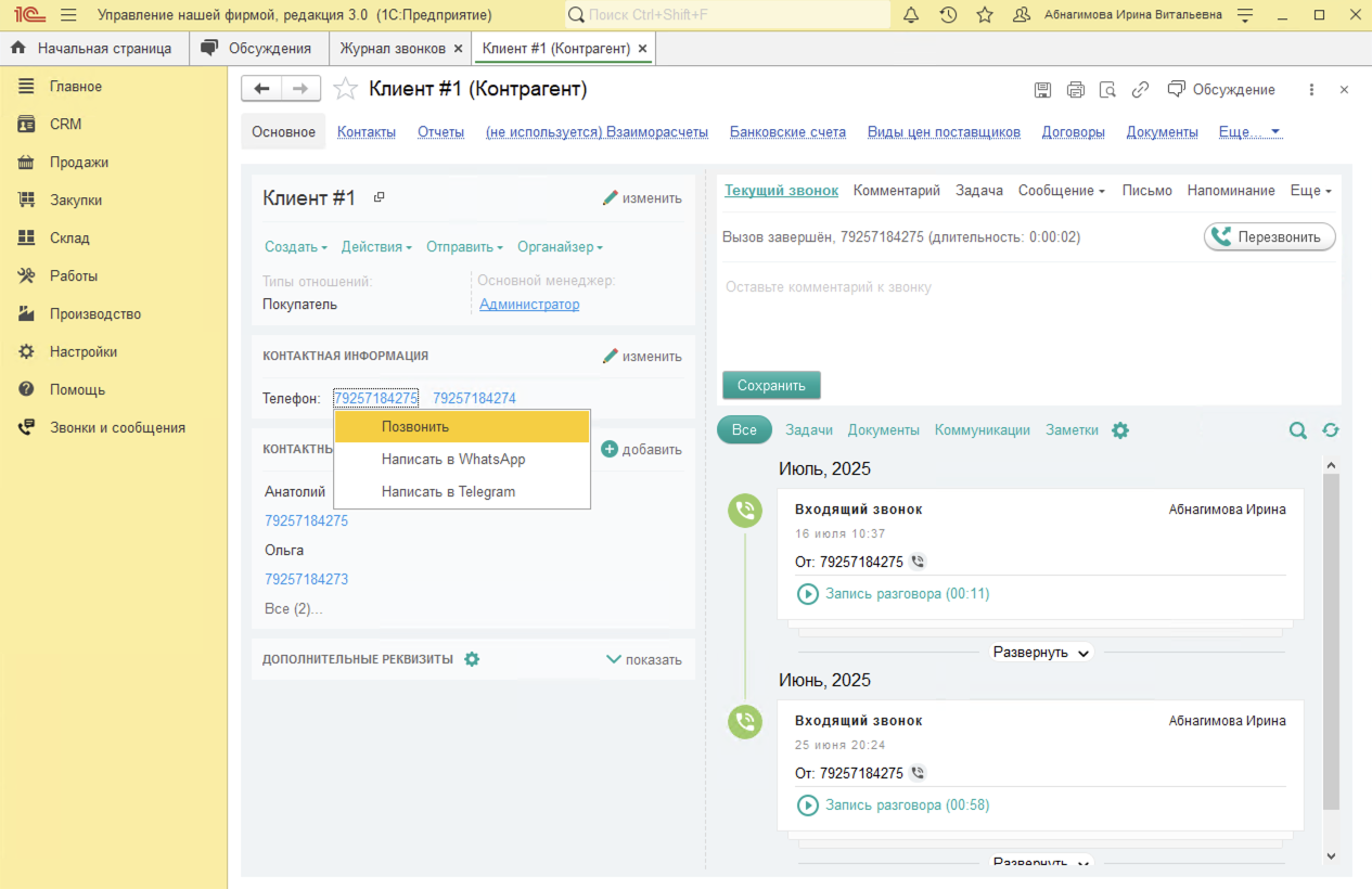 - Позвонить из 1С из документа Лента можно прямо по клику на номер телефона в блоке Контактная информация или номером сотрудника клиента в блоке Контактные лица.
