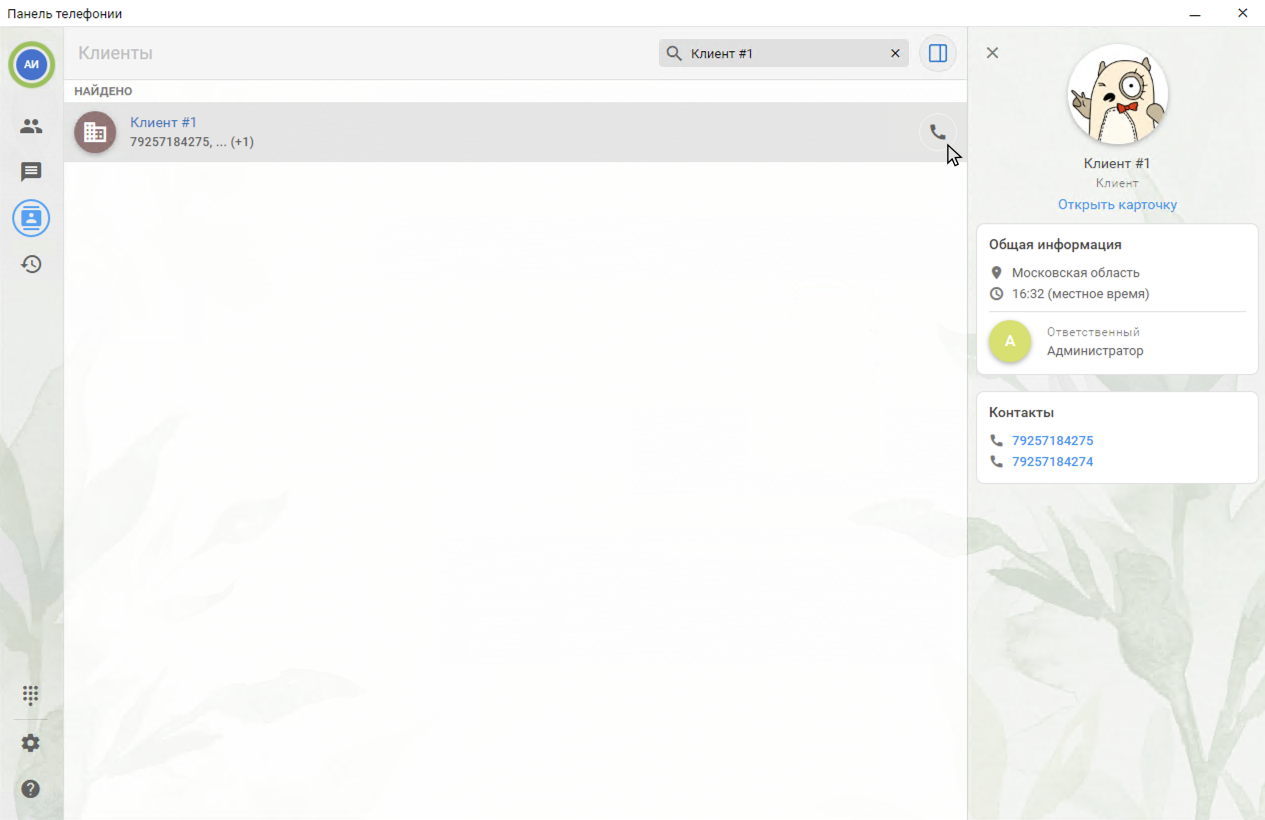 - Исходящий звонок можно инициировать через строку умного поиска в Панели телефонии. При вводе номера телефона, имени клиента или контактного лица система отобразит соответствующие записи из базы 1С:Управление нашей фирмой. Чтобы совершить звонок, наведите курсор на нужную строку и нажмите на иконку телефонной трубки.